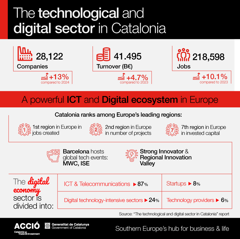 In Barcelona-Catalonia, technology companies join a network of more than 28,000 companies operating in the digital and technology sector, a 13% year-on-year increase, according to The technology and digital sector in Catalonia, published by Catalonia Trade & Investment