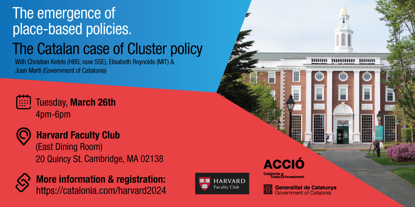 Catalonia Trade & Investment is organizing an event at Harvard University, USA, to share knowledge on place-based policies around the world and to showcase Catalonia's success story in cluster policy.