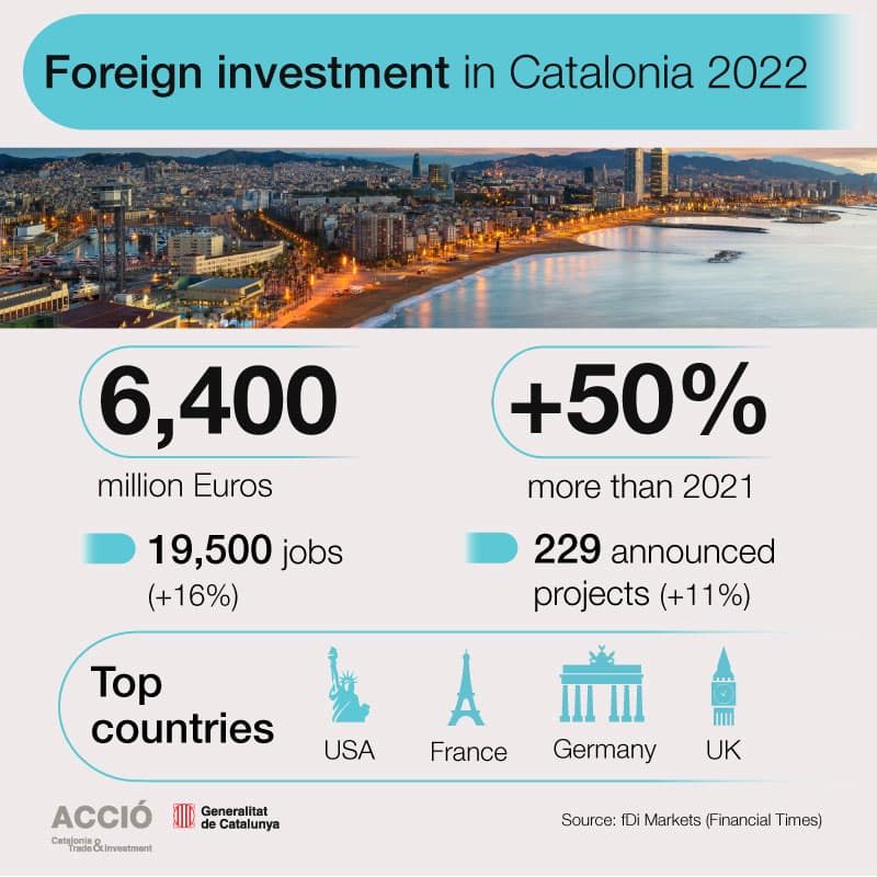 Catalonia has attracted €6,428 million in foreign investment in 2022, a 50% increase over the previous year. According to data from ACCIÓ-Catalonia Trade & Investment, based on the fDi Markets database from the Financial Times group, this is the highest figure in the entire historical series, first recorded in 2003. This database is among the most prestigious international tools multinational companies use to study future business investment projects.