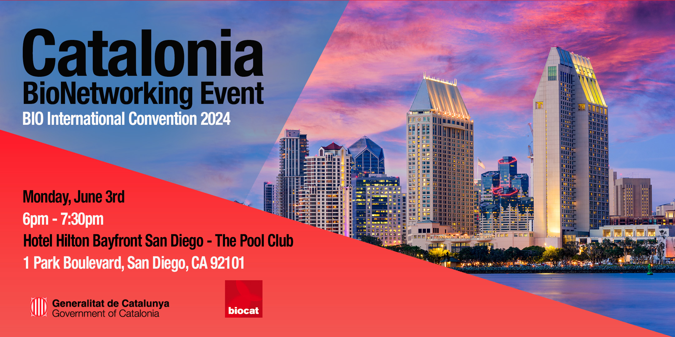 The Catalonia BioNetworking Event will take place on Monday, June 3, from 6 pm to 7:30 pm, after the BIO International Convention 2024. It will be held at Hotel Hilton Bayfront San Diego -The Pool Club, 1 Park Boulevard, CA 92101. It will provide a unique opportunity to connect with other companies and professionals, share knowledge, and create synergies in the biotech industry.