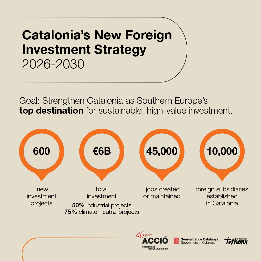 The main goals of the new strategy include reaching 600 investment projects with Government support by 2030, generating €6 billion in investment, and creating and maintaining 45,000 jobs. The Government also aims to reach a total of 10,000 foreign subsidiaries established in Catalonia.