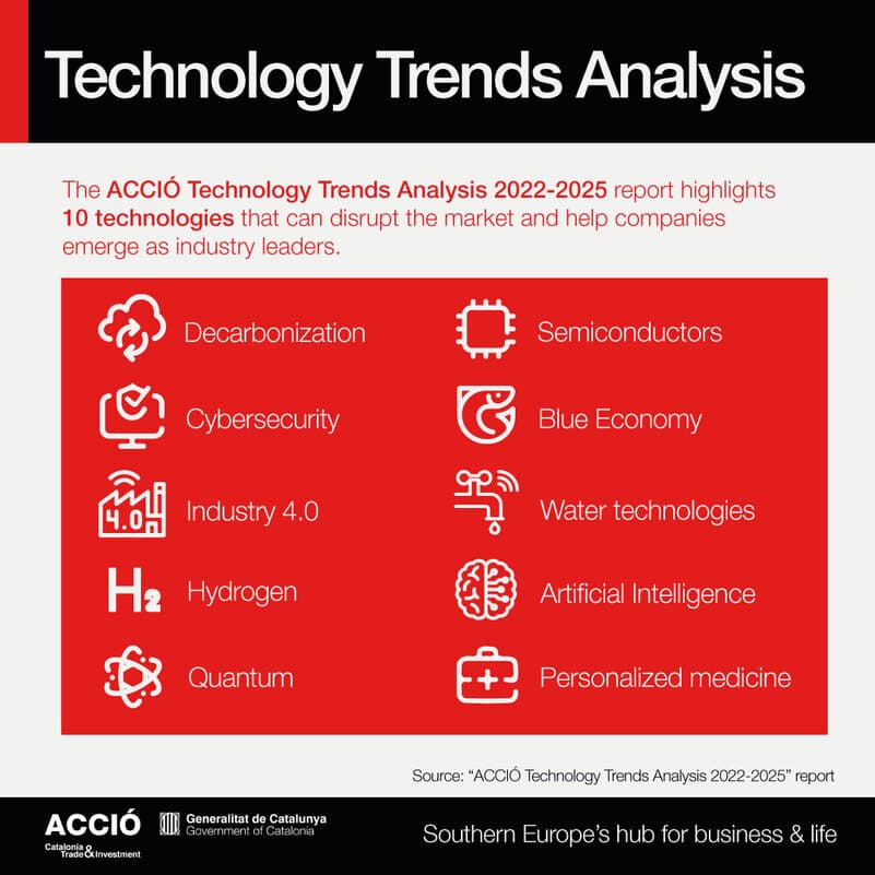 All in all, ACCIÓ-Catalonia Trade & Investment prioritizes 20 technology trends that will have a significant impact in Catalonia until 2025. The different criteria behind this selection are all in line with Catalan Government policies and based on critical mass and potential as well as the preparation of future ecosystems plus forecasted growth.